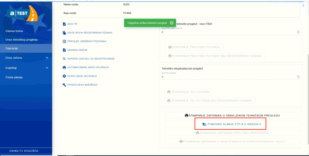 Dugme “Ponovno slanje ETP-a u IDDEEA-u” će se pojaviti samo ukoliko zapisnik ne bude prolazio u IDDEEA-u.